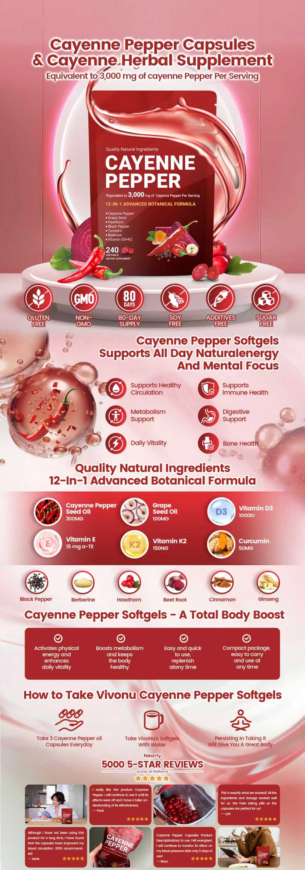 - 📆【80-Day Supply, 240 Easy-to-Swallow Capsules】 Each Bag Contains 240 Softgels (One serving per day - 3 capsules per serving), Each Serving Contains 1000mg of Cayenne Pepper & Grape Seed Oil Extract, Offering Lasting Value and Convenience for Daily Wellness Routines