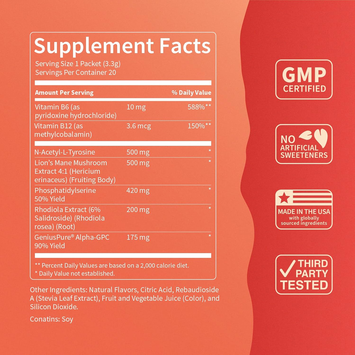 Drink Mix – Fruit Punch Flavor – Alpha GPC, Lion’s Mane, Rhodiola & N-Acetyl L-Tyrosine – Sugar-Free, On-The-Go Packets – 20 Servings